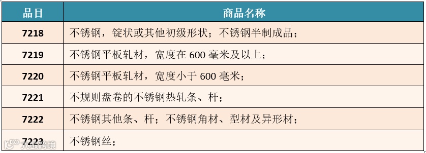 根据《进出口税则对照使用手册(2020版)》,不锈钢主要归入品目7218至7223项下。