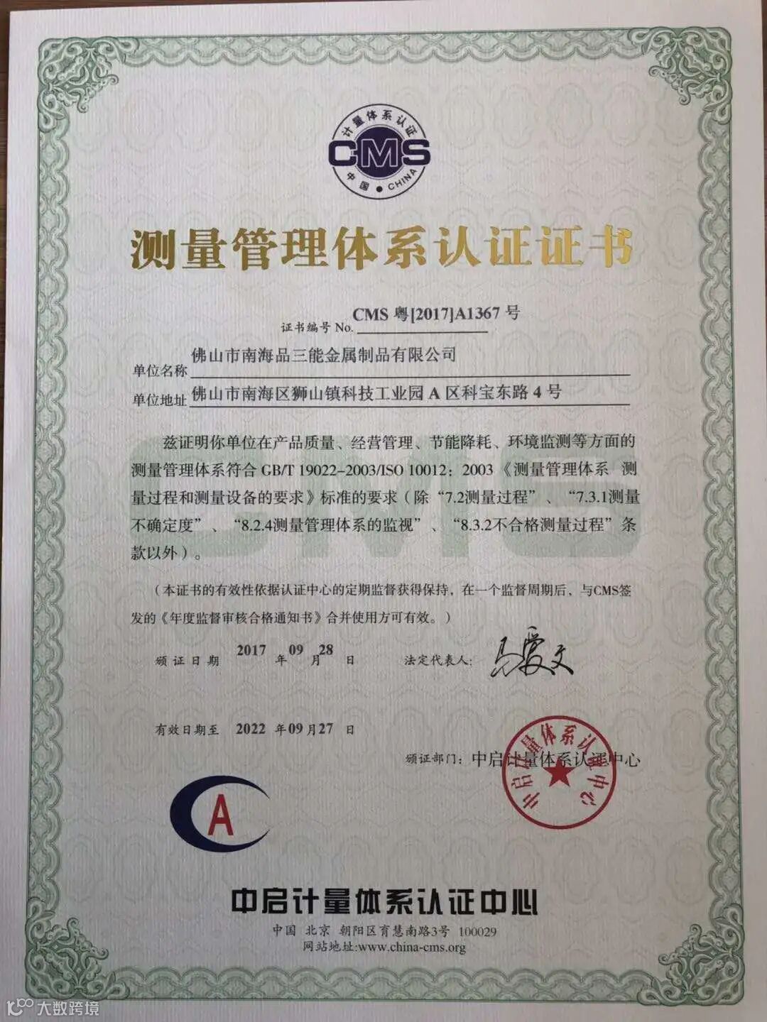 三能公司在产品质量,经营管理,节能降耗,GB/T19022-2003/ISO 10012:2003等测量管理体系到达企业标准!拿下测量管理体系认证证书!