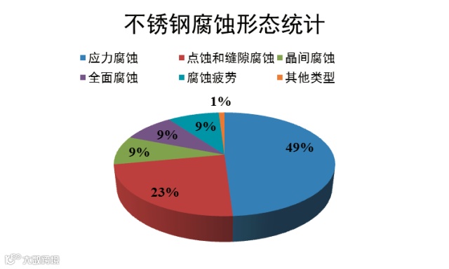 不锈钢发生的腐蚀破坏多是局部腐蚀破坏,最常见的有晶间腐蚀(9%)、点蚀(23%)和应力腐蚀(49%)。[1]