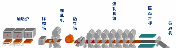 不锈钢热轧工艺是以板坯(主要为连铸坯)为原料,经加热后由粗轧机组及精轧机组制成带钢。从精轧最后一架轧机出来的热钢带通过层流冷却至设定温度,由卷取机卷成钢卷,冷却后的钢卷外表有氧化皮,呈现黑色,俗称“不锈钢黑皮卷”。经过退火酸洗,去掉氧化表面,即为“不锈钢白皮卷”,不锈钢市场流通的大部分热轧产品为不锈钢白皮卷。具体不锈钢热轧生产工艺流程如下: