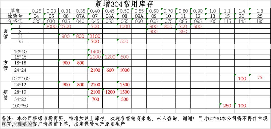 备注:三能公司根据市场需要,特增加以上库存,欢迎各经销商来电、来人咨询,谢谢!同时60*30本公司将不再作常规库存,需要的客户请提前下单,按定做管生产原则生产。
