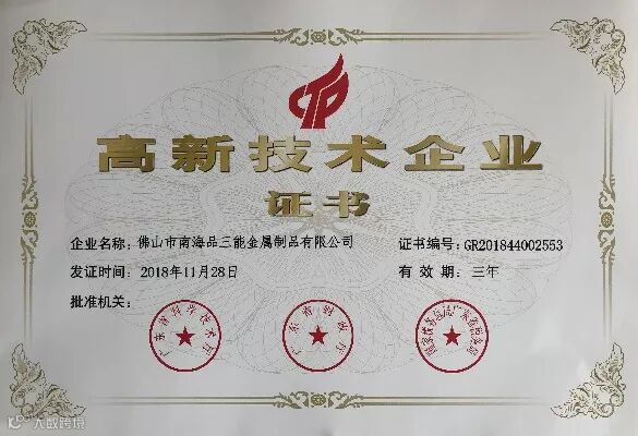 2019年5月13日我司获得由广东省科学技术厅、广东省财政厅、国家税务总局广东省税务局联合颁发的“高新技术企业”证书。高新技术企业的认定,是对三能公司一贯推行创新管理,品牌建设方面给予了充分的肯定。2019年下半年三能公司将继续狠抓产品质量、狠抓安全生产的同时,进一步健全、完善公司经营管理系统,打造一个高效的团队,不忘初心、牢记使命,砥砺奋进、在高质量的道路上跨步前进。