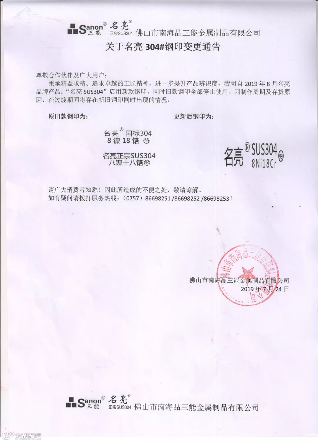 秉承精益求精、追求卓越的工匠精神,进一步提升产品辨识度,我司自2019年8月名亮品牌产品:“名亮SUS304”启用新款钢印,同时旧款钢印全部停止使用。因制作周期及存货原因,在过渡期间将存在新旧钢印同时出现的情况,请广大消费者知悉!因此所造成的不便之处,敬请谅解。 如有疑问请拨打服务热线:(0757) 86698251 /86698252 /86698253