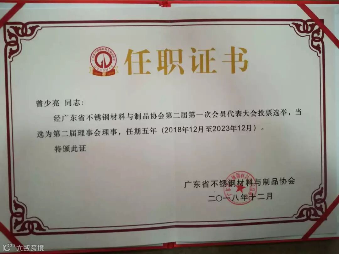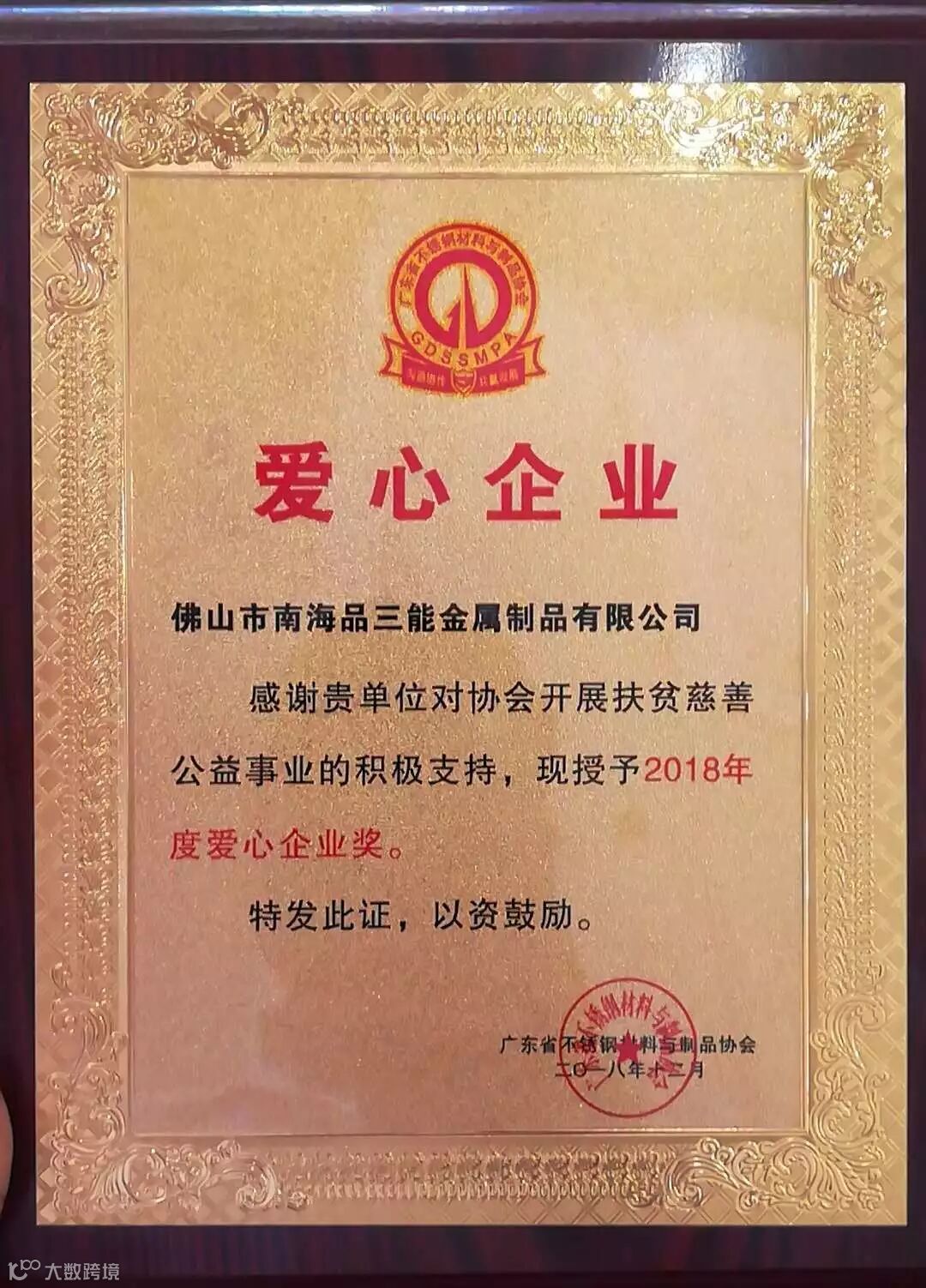 扬帆起航再出发,行稳致远正当时。5年,这是广东省不锈钢材料与制品协会一步一个脚印走过的岁月。5年的成长,5年的蜕变。弹指一挥间,广东省不锈钢材料与制品协会迎来了新一届理事会和领导班子就职。在大会上,我司品三能金属制品有限公司董事长曾少亮先生荣幸在此次大会上继任新一届理事会理事,以及在大会上获得“2018年度爱心企业奖”,感谢协会及业界同行对于品三能认可。