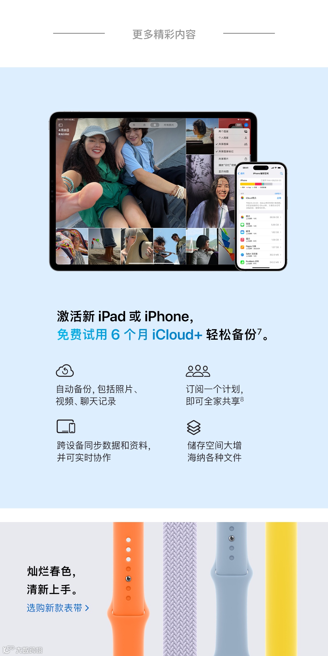 。灿烂春色,清新上手。点击前往选购新款表带。以下是本文的注释和相关条款:1. 上述所示分期付款金额仅为使用特定期数免息分期付款估算得出的示例 (仅显示整数数额,未显示小数点以后的金额),实际支付金额以银行或花呗账单为准。最高可享 24 期免息分期,到 Apple Store 零售店和在线商店购买时可享受的免息分期期数和最低限额可能有所不同,银行和花呗提供的免息分期期数和最低限额可能有所不同。实际折抵金额取决于设备的状况、配置、推出年份,以及发售国家或地区。银行或花呗可能要求你的可用信用额度大于所购买产品的总金额,才能使用分期付款服务。有关