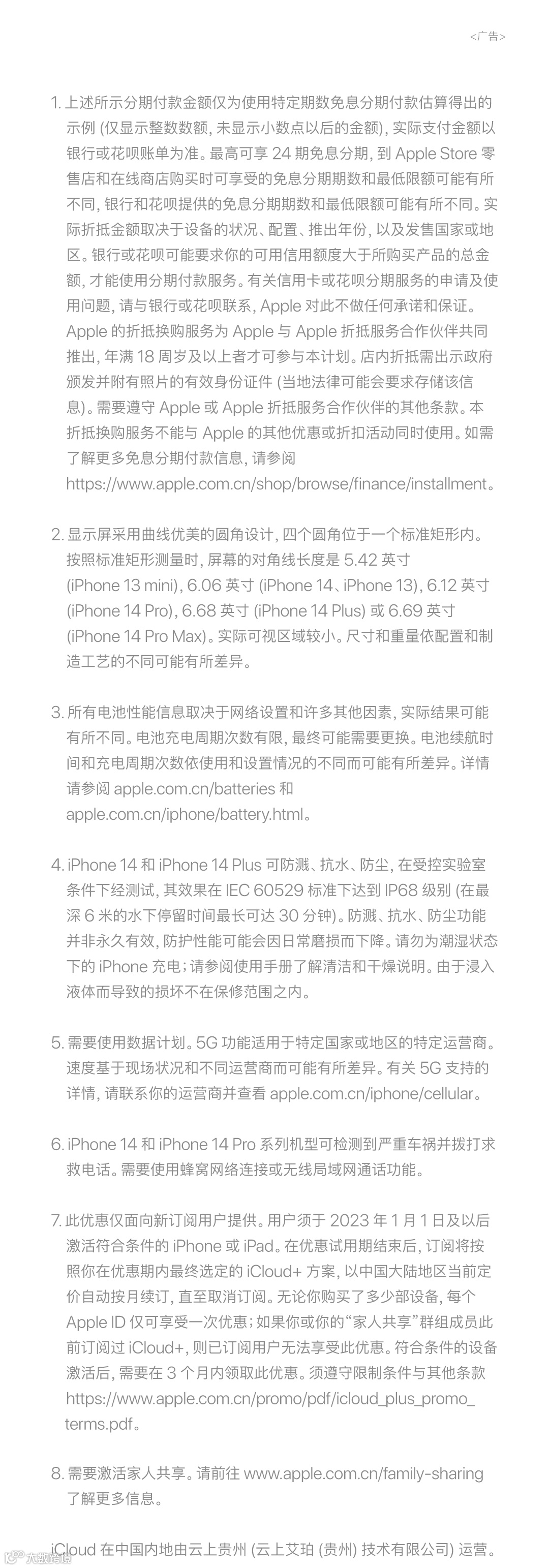 基于现场状况和不同运营商而可能有所差异。有关 5G 支持的详情,请联系你的运营商并查看 apple.com.cn/iphone/cellular。6. iPhone 14 和 iPhone 14 Pro 系列机型可检测到严重车祸并拨打求救电话。需要使用蜂窝网络连接或无线局域网通话功能。7. 此优惠仅面向新订阅用户提供。用户须于 2023 年 1 月 1 日及以后激活符合条件的 iPhone 或 iPad。在优惠试用期结束后,订阅将按照你在优惠期内最终选定的 iCloud 加方案,以中国大陆地区当前定价自动按月续订,直至取消订阅。无论你购买了多少部设备, 每个 Apple ID 仅可享受一次优惠;如果你或你的“家人共享”群组成员此前订阅过 iCloud 加,则已订阅用户无法享受此优惠。符合条件的设备激活后,需要在 3 个月内领取此优惠。须遵守限制条件与其他条款 https://www.apple.com.cn/promo/pdf/icloud_plus_promo_terms.pdf。8. 需要激活家人共享。请前往 www.apple.com.cn/family-sharing 了解更多信息。iCloud 在中国内地由云上贵州 (云上艾珀 (贵州) 技术有限公司) 运营。你关心的Apple内容。新发布,涨知识,学技能。长按关注Apple官方微信。还有24小时答疑解惑。