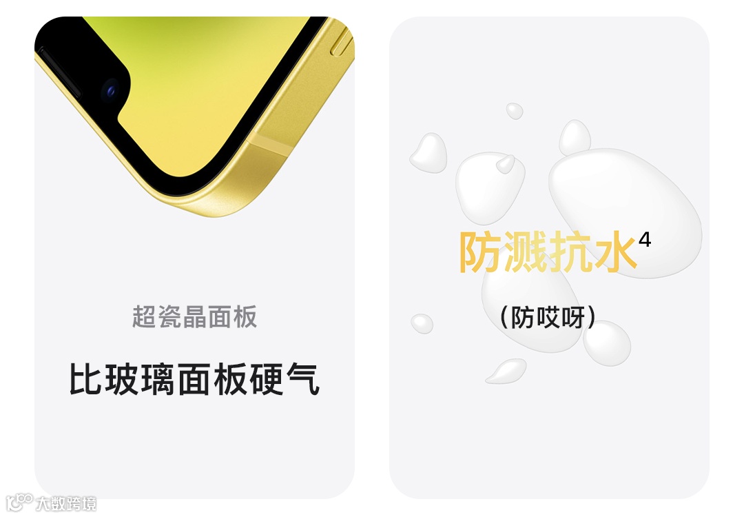 和充电周期次数依使用和设置情况的不同而可能有所差异。详情请参阅 apple.com.cn/batteries 和 apple.com.cn/iphone/battery.html。4.iPhone 14 和 iPhone 14 Plus 可防溅、抗水、防尘,在受控实验室条件下经测试,其效果在 IEC 60529 标准下达到 IP68 级别 (在最深 6 米的水下停留时间最长可达 30 分钟)。防溅、抗水、防尘功能并非永久有效,防护性能可能会因日常磨损而下降。请勿为潮湿状态下的 iPhone 充电;请参阅使用手册了解清洁和干燥说明。由于浸入液体而导致的损坏不在保修范围之内。5. 需要使用数据计划。5G 功能适用于特定国家或地区的特定运营商。