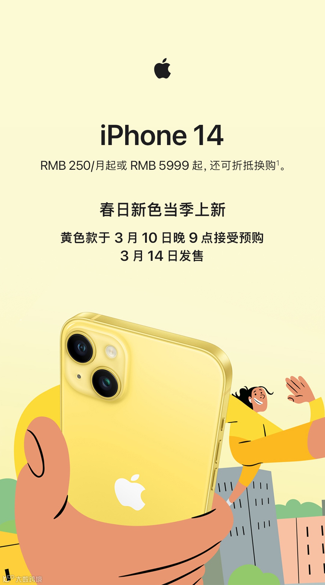 iPhone 14。人民币二百五十元每月起或人民币五千九百九十九元起,还可折抵换购,参见注释 1。春日新色当季上新。黄色款于 3 月十日晚 9 点接受预购,3 月十四日发售。盼望着,盼望着,东风来了,iPhone 14 和 iPhone 14 Plus 的一抹明黄,亮了。大咖与超大咖。iPhone 十四,6.1 英寸,参见注释 2。iPhone 十四 Plus,6.7 英寸,参见注释 2。iPhone 十四 Plus 超长长长长续航,创 iPhone 新高,参见注释 3。超瓷晶面板。比玻璃面板硬气。防溅抗水,防哎呀,参见注释 4。运动模式。手不稳,视频照样拍得稳。A十五仿生,一直飙一直快。疾速 5G,参见注释 5。Pro 水准摄像头,拍得人人叫好。车祸检测功能,参见注释 6。个性化。选照片、挑字体、配小组件,你拍板。自拍更清晰,更智能,更利落。“一年之计在于春”,刚起头儿,就有一抹明黄新入列。黄色款于 3 月十日晚 9 点接受预购。3 月十四日发售。人民币二百五十元每月起或人民币五千九百九十九元起,还可折抵换购,参见注释 1。春天里的 iPhone 14 能有多亮眼,点击前往相关页面看个够。更多精彩内容。激活新 iPad 或 iPhone,免费试用 6 个月 iCloud 加轻松备份,参见注释 7。自动备份,包括照片、视频、聊天记录。跨设备同步数据和资料,并可实时协作。订阅一个计划,即可全家共享,参见注释 8。储存空间大增,海纳各种文件。点击前往相关页面,进一步了解 iCloud 加