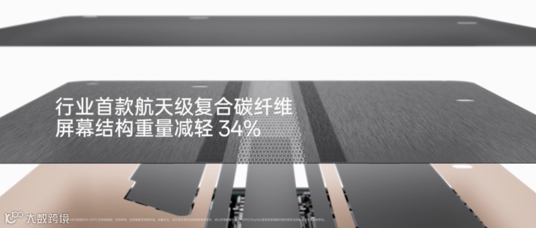 为了给手机减重,OPPO把屏幕骨架换成更轻、强度更高的碳纤维材质。铰链连接屏幕机构的斜板,换成了高强度复合碳纤维材质。