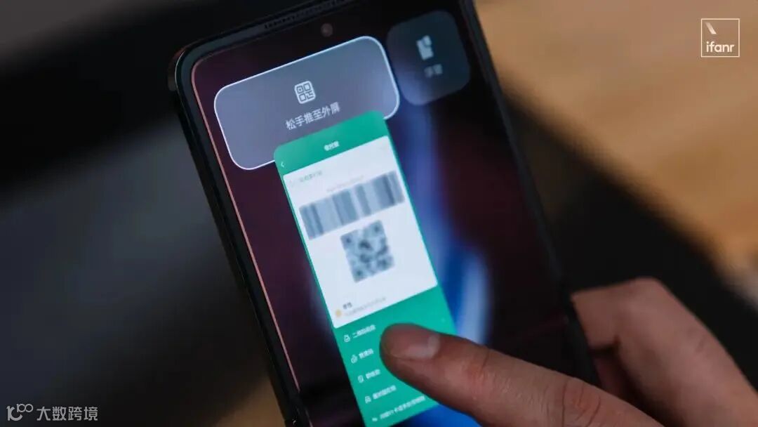 当我们打开支付码、取票码等对外展示的画面时,可以将 app 上滑拖入左边「松手推至外屏」,这时,支付码就会在外屏显示了,大屏依然能进行其他操作,不用尬在支付页面排队等待。