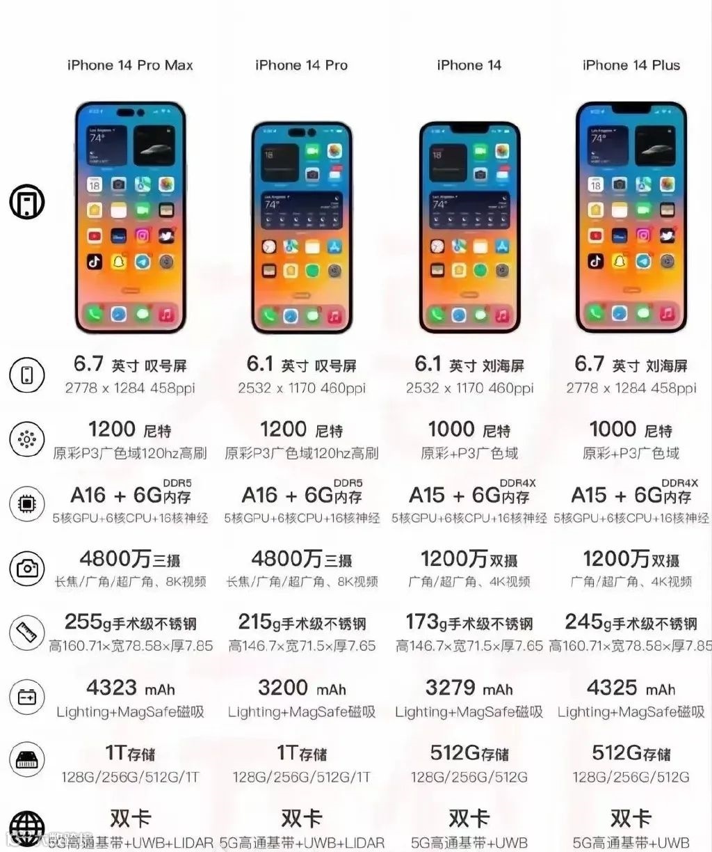 iPhone 14和14 Plus作为入门款,配备了60Hz刘海屏、A15处理器、1200W主摄等,而高配版的Pro系列将采用全新的120Hz感叹号挖孔屏、A16处理器、4800W三摄等。