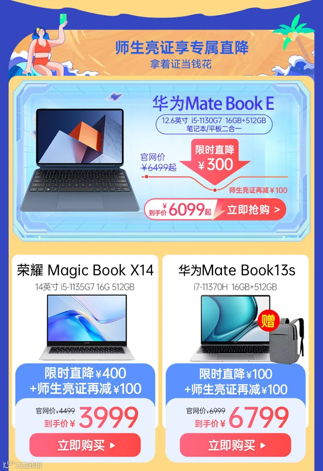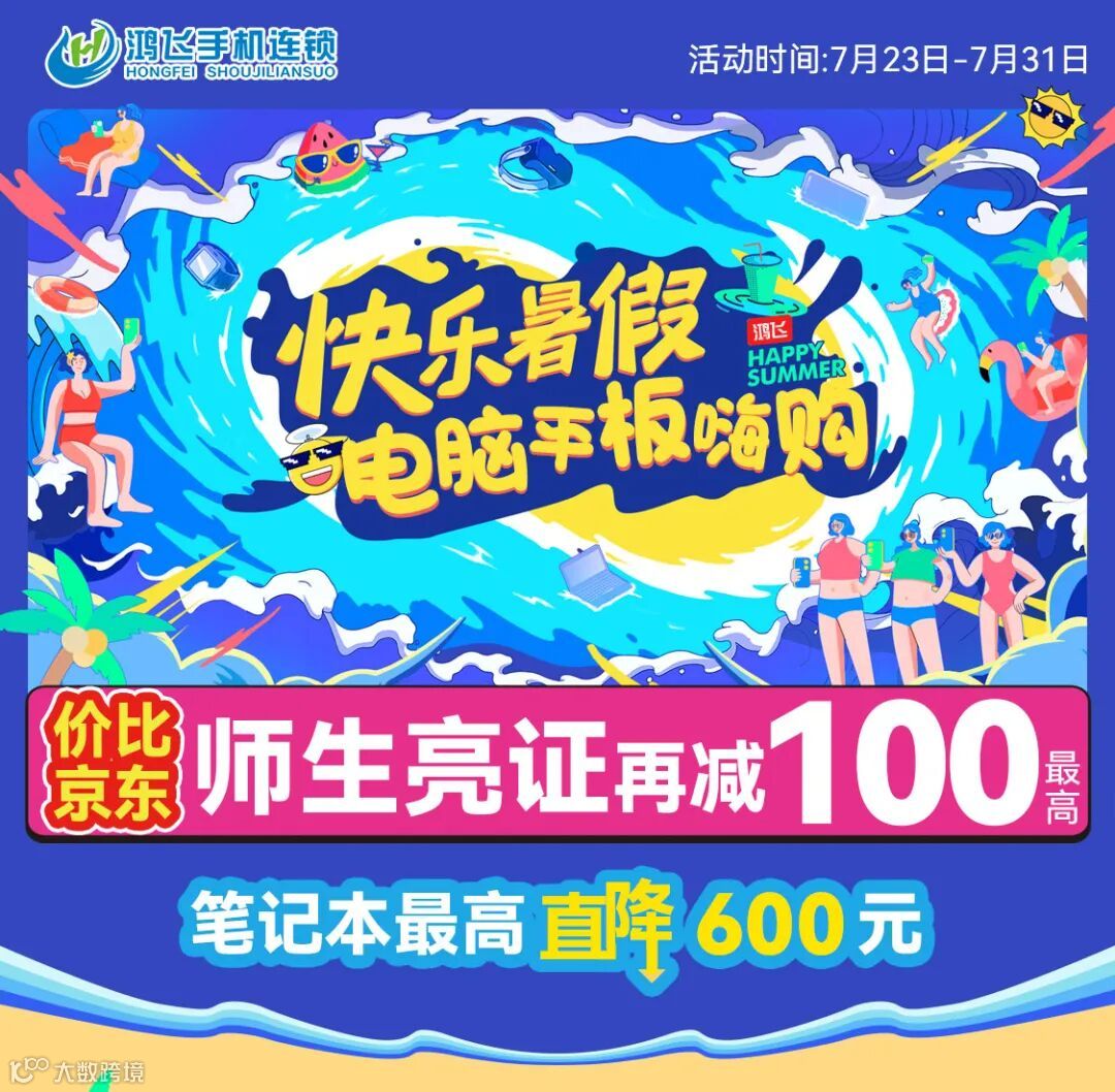 快乐暑假,电脑平板嗨购~价比京东,笔记本最高直降600元,师生亮证再减最高100元 鸿飞手机连锁