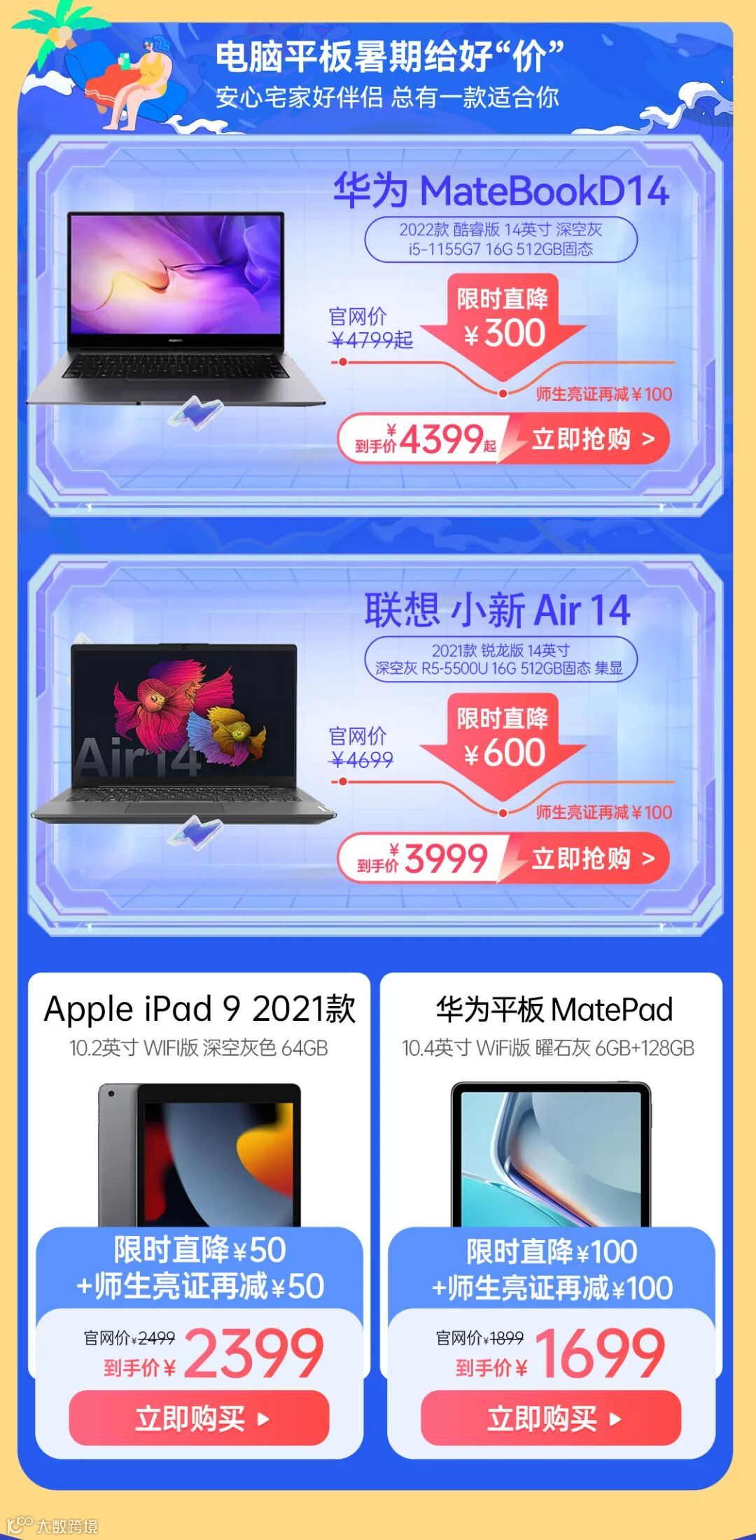 快乐暑假,电脑平板嗨购~价比京东,笔记本最高直降600元,师生亮证再减最高100元