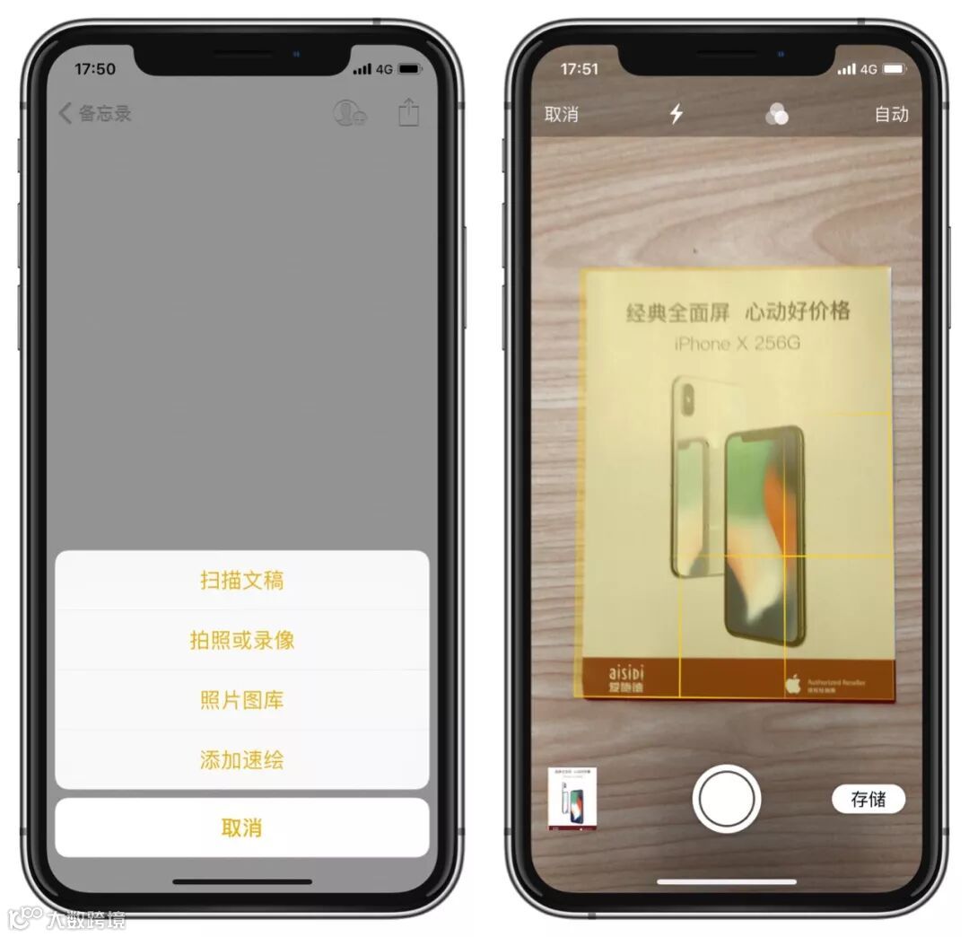 [备忘录 - 新建备忘录 - 选择“+”号 - 扫描文稿 - 将文稿放在取景框 ]