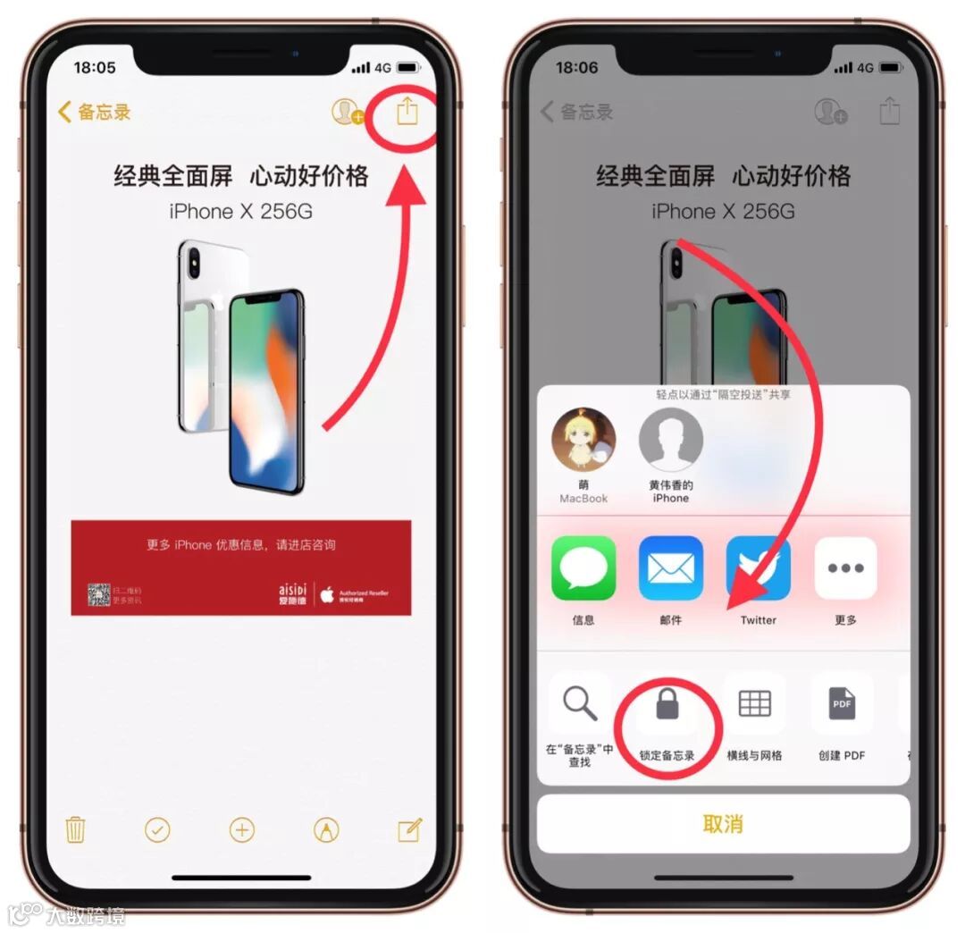 [打开备忘录 - 添加照片或文字 - 右上角的共享按钮 - 锁定备忘录]