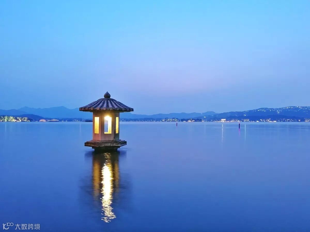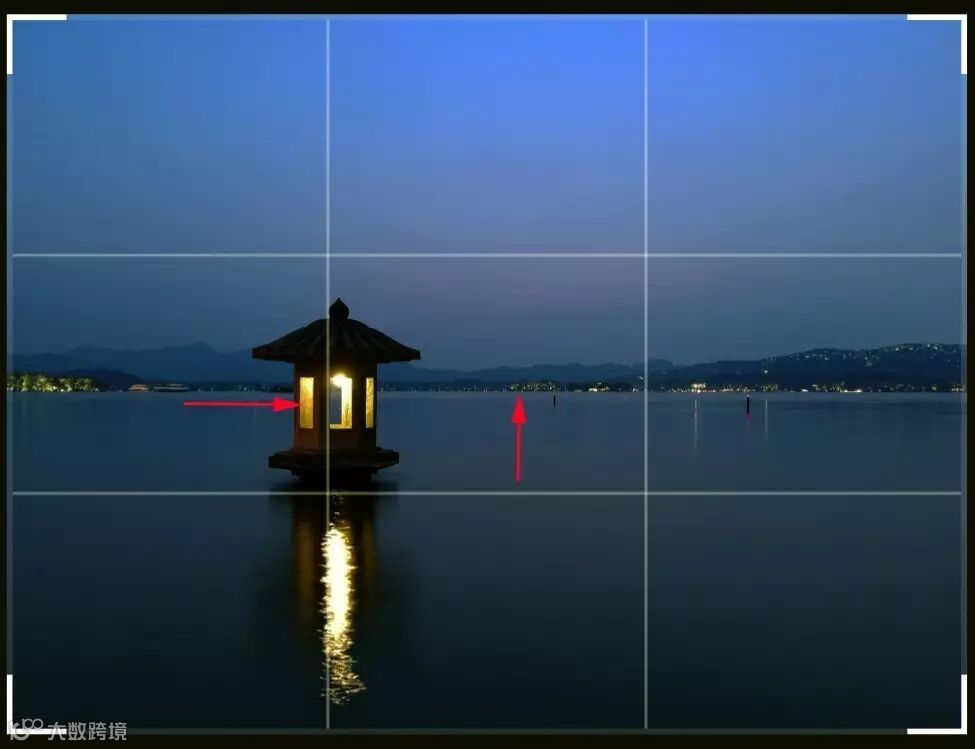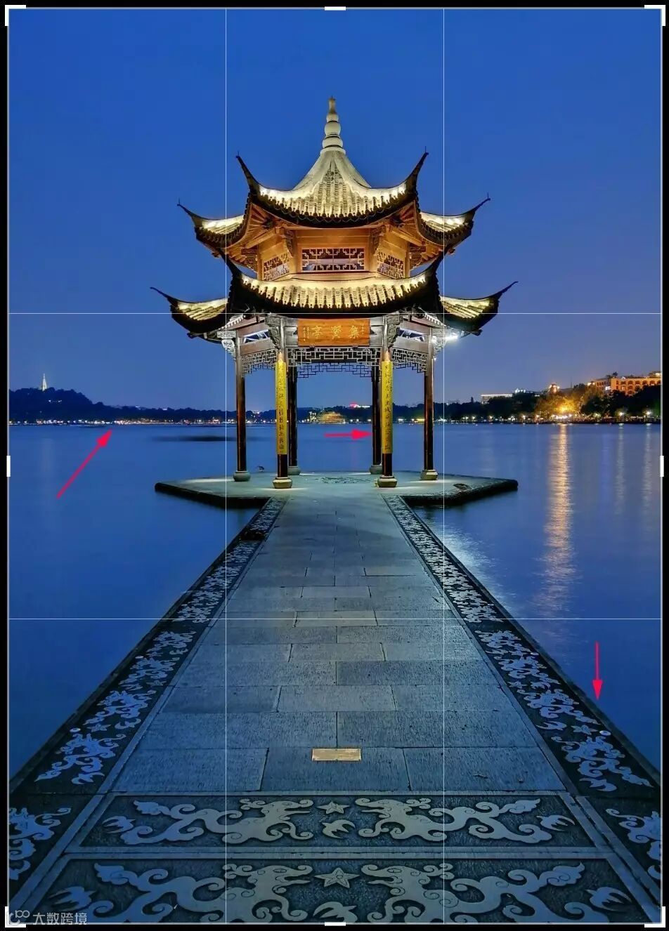 构图:固定手机,打开参考线,选择黄金比例,将亭子放在三分之一处,保证画面的比例协调,注意远端水平线。