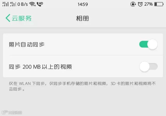 开启方法:进入【设置】-【云服务】-【相册】,开启【照片自动同步】。如需同步大于200M的视频,还需开启【同步200M以上的视频】。