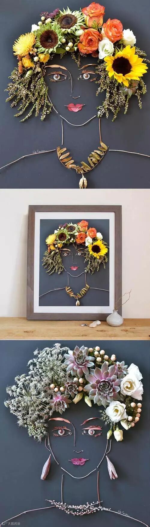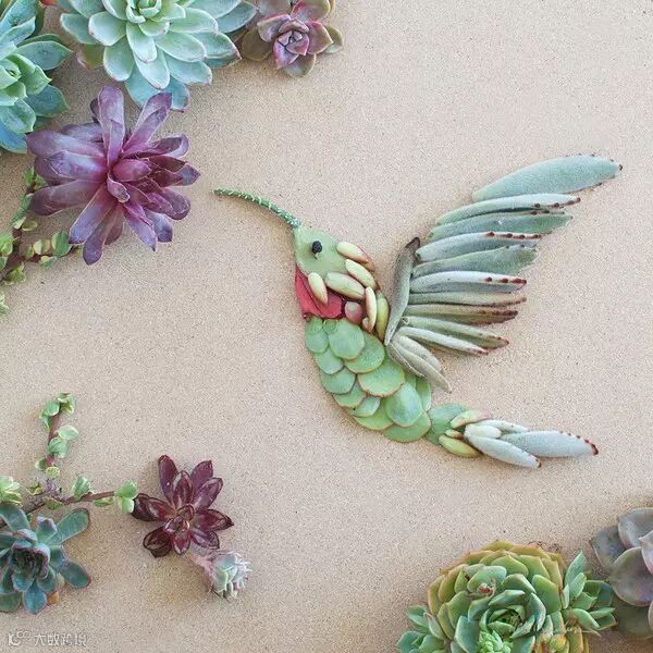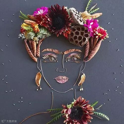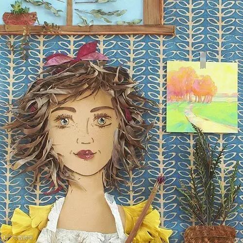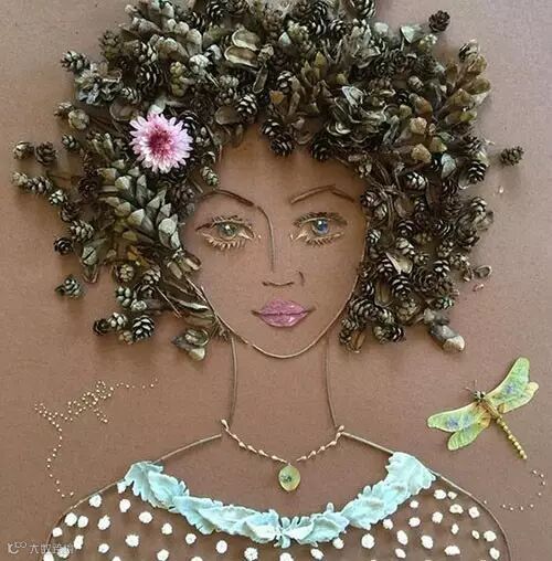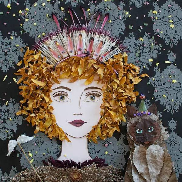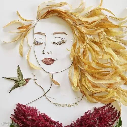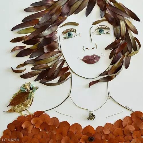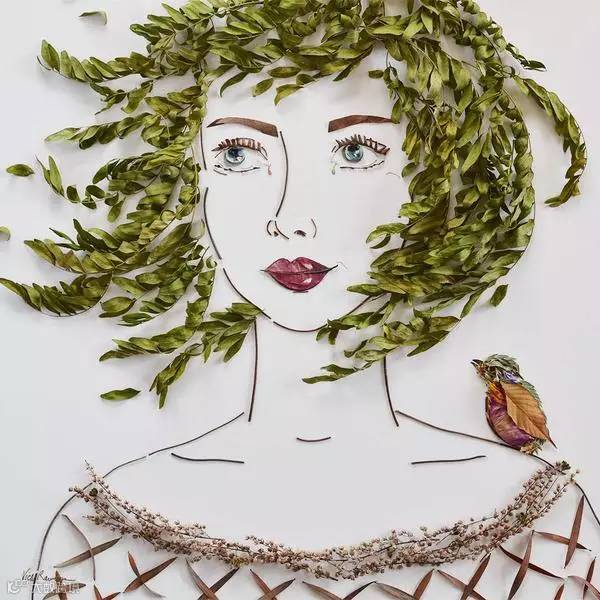 Vicki每次外出,都会随身携带收纳袋,收集一些落叶、石子、树枝,她说:“我会花很多时间出门散步并且专注每平方英寸的环境”。在她们手中,狗尾巴草可能会成为一只眉毛,毫不起眼的枯枝可以变成颧骨或者下巴。