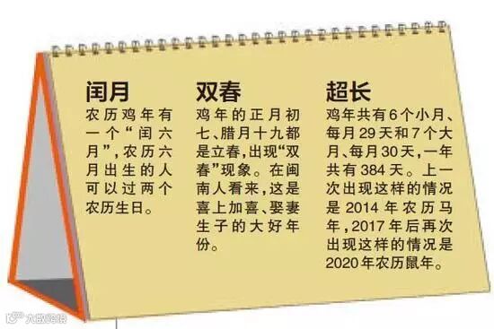 即将到来的农历鸡年有一个“闰6月”,因此,这个鸡年共有6个小月,每月29天和7个大月,每月30天,一年共有384天。上一次出现这样的情况是2014年的农历马年。2017年之后再次出现这样的情况是2020年的农历鼠年。