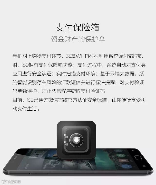 金立S9通过正版金融类应用检测、支付环境扫描、验证码防窃取、指纹支付、汇款风险提示等功能对整个支付过程进行全方位保护。