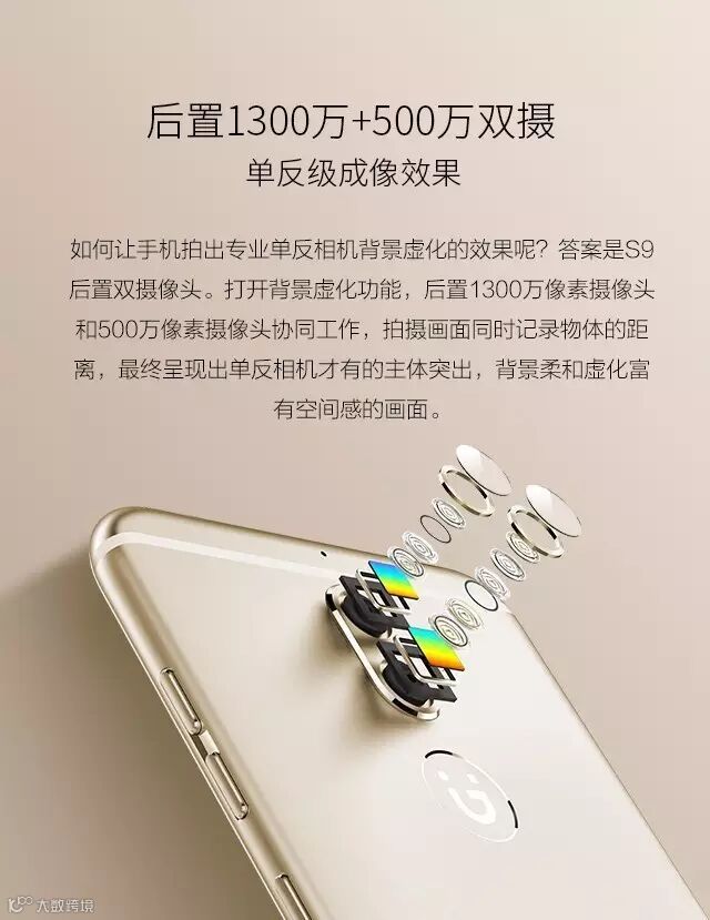 金立S9搭载了1300万像素+500万像素双摄像头。两颗摄像头协同工作,轻松实现单反级的背景虚化效果,真正做到了先拍照后对焦。