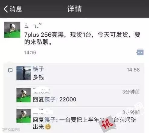 于是黄牛不顾风险,开始囤货,如今苹果iPhone 7已经上市一周了,各个苹果Apple Store门口不无出现黄牛的身影。但今年对于苹果新机的发售,却显得没那么理想和爆棚,高价收购的iPhone7亮黑色还没出手就已跌至1.2万左右,而苹果iPhone 7plus 256GB版的价格达到了2.2万,原本一夜暴富的梦想,随着暴跌的价格一夜回到了解放前,这次黄牛哭了!难怪上海疑似苹果价格暴跌而为之跳楼的黄牛要死要活的。