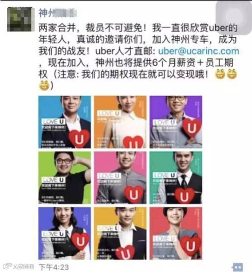 在这封情书之前,神州优车董事长兼CEO陆正耀在朋友圈发布了这一组招聘海报,配文两家合并,裁员不可避免。我一直很欣赏Uber的年轻人,真诚的邀请你们,加入神州专车,成为我们的战友!Uber人才直邮: uber@ucarinc.com,现在加入,神州也将提供6个月薪资+员工期权。(注意: 我们的期权现在就可以变现哦)