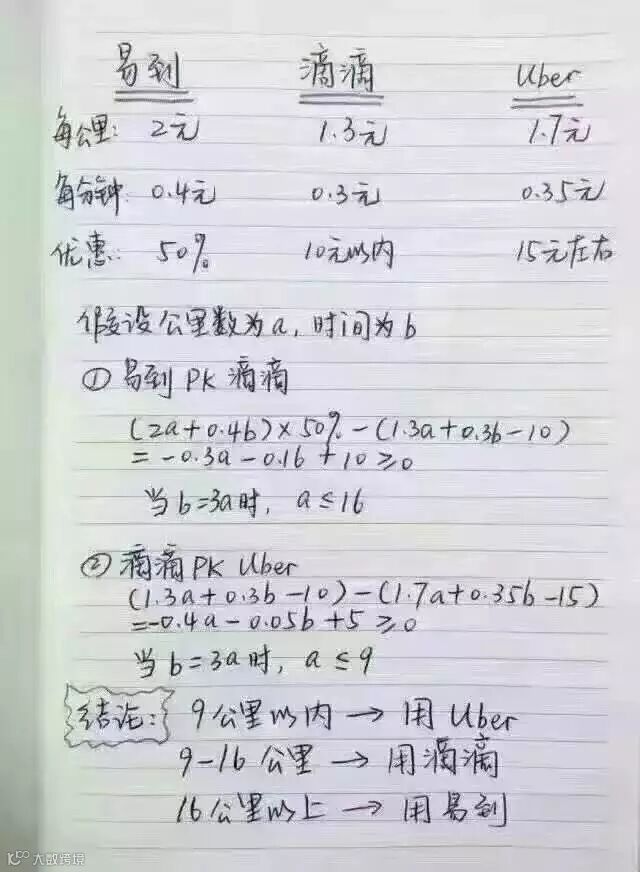 滴滴Uber合并之后,普通人最关心的可能就是以后出行的价格会不会上涨,此前朋友圈流传一些关于计算打车软件哪款更划算的数学题的照片。这个版本中没有将神州归为对比对象。虽然有点戏谑的成分,但从侧面能够看出神州和其他专车直接的差异化,这种差异化最直观的表现就是价格,但深层次差异还是产品与服务。