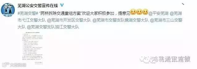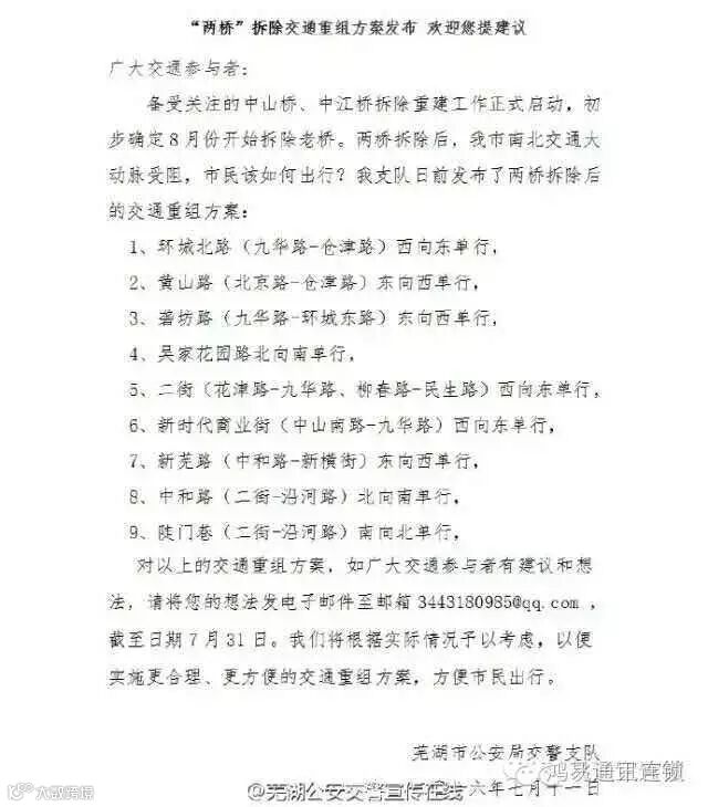 为切实做好中江桥、中山桥“两桥”拆除期间市区道路交通管理工作,维护良好的道路通行秩序,保障市民有序出行。交警部门自6月27日至7月31日,在“市民心声”网站、大江晚报、交警官方微博“芜湖公安交警宣传在线”等媒体上,发布了“两桥”拆除期间交通重组方案征求意见稿。截至目前,总阅读量达2.3万次,归纳出相关意见建议9类。