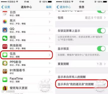 第2步:进入通知中心之后,在里面选择“信息”。找到“显示以下人员的iMessage提醒”,在里面选择“显示来自我的通讯录的提醒”选项。