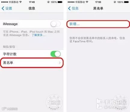 第3步:新的系统增加了一个黑名单的屏蔽功能,点击设置,选择信息,点击黑名单。选择新增,然后系统会自动弹出你的所有联系人,选择你要屏蔽的联系人,你将不会收到黑名单中联系人的来电,信息或者FaceTime呼叫。