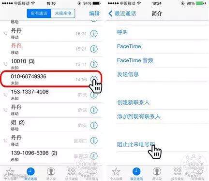 如果要拦截陌生的电话号码,可以在最近的通话记录中找到要阻止的电话号码,然后点击感叹号,进入详细页面,选择阻止此来电号码,阻止号码后你将不会受到黑名单中的联系人来电,短信和FaceTime呼叫。如果要取消阻止点击取消阻止此来电号码即可。