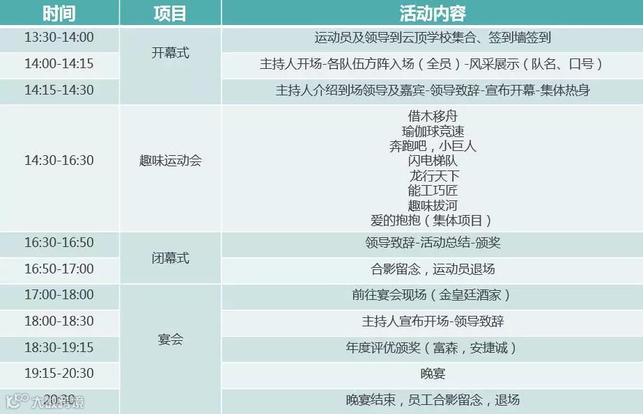 四、活动项目:借木移舟、瑜伽球竞速、奔跑吧小巨人、闪电梯队、龙行天下、能工巧匠、趣味拔河、爱的抱抱(集体项目)