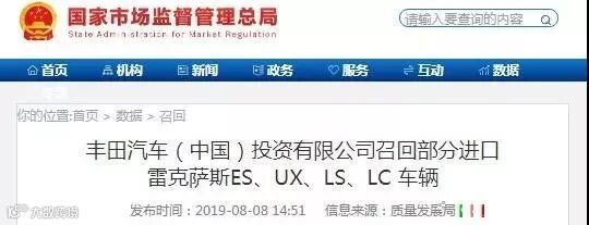 召回 2019年5月6日至2019年5月31日期间生产的部分进口雷克萨斯ES、UX、LS及LC车辆,共计4,715辆。具体如下: