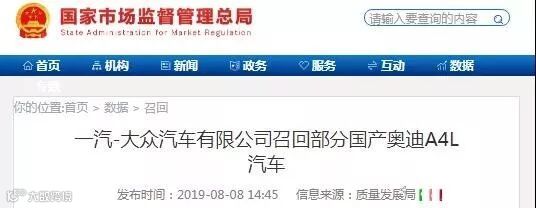 召回2016年4月28日至2018年9月20日生产的部分国产2017-2019款奥迪A4L汽车,共计4605辆。