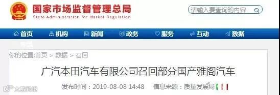 召回2017年7月25日至2019年8月7日期间生产的装备1.5T涡轮增压发动机的部分国产雅阁汽车,共计222674辆。