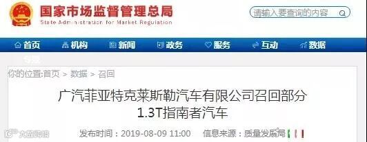 召回2019年2月28日至2019年7月25日期间生产的部分2019年款装备1.3T发动机的指南者汽车,共计9052辆。