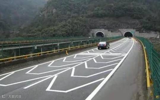错视觉标线是一种特种的减速标线,通常设置在急转弯、隧道外及隧道内一定区域,能让驾驶员产生空间压缩的感觉,沿行车方向看车道呈现由宽变窄及道路下凹的错视觉效果,促使驾驶员在进入急转弯或隧道前提前减速,起到一定的安全防范辅助作用。