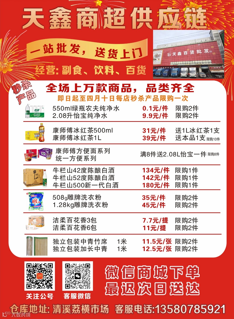 开店进货,就找天鑫一站购齐。本公司经营批发副食酒水,饮料泡面,日化纸巾,日用小百货,拖鞋......持续上新,物美价廉。天鑫供应链是十年老店,已服务商超便利店上千家,全场上万款商品条码。诚邀各镇区店主注册下单。公司地址在清溪荔横市场。