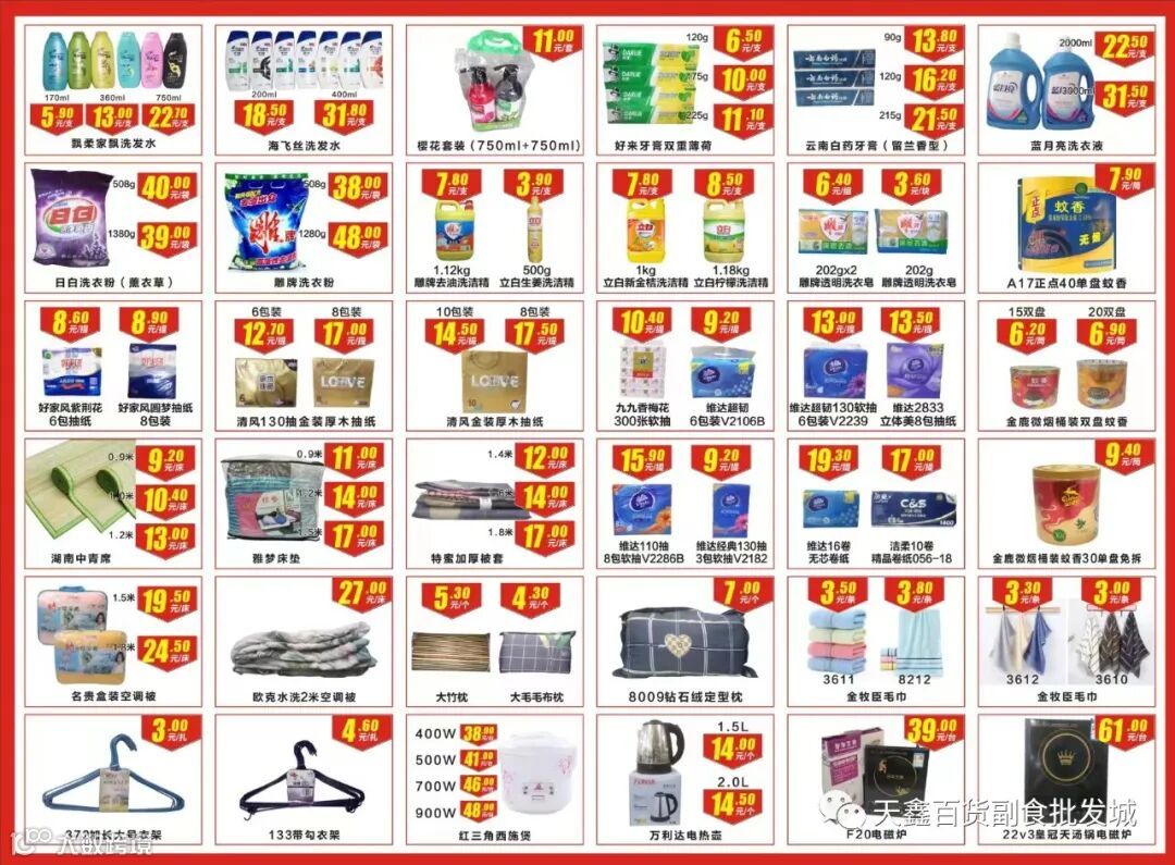 开店进货,就找天鑫一站购齐。本公司经营批发副食酒水,饮料泡面,日化纸巾,日用小百货,拖鞋......持续上新,物美价廉。天鑫供应链是十年老店,已服务商超便利店上千家,全场上万款商品条码。诚邀各镇区店主注册下单。公司地址在清溪荔横市场。