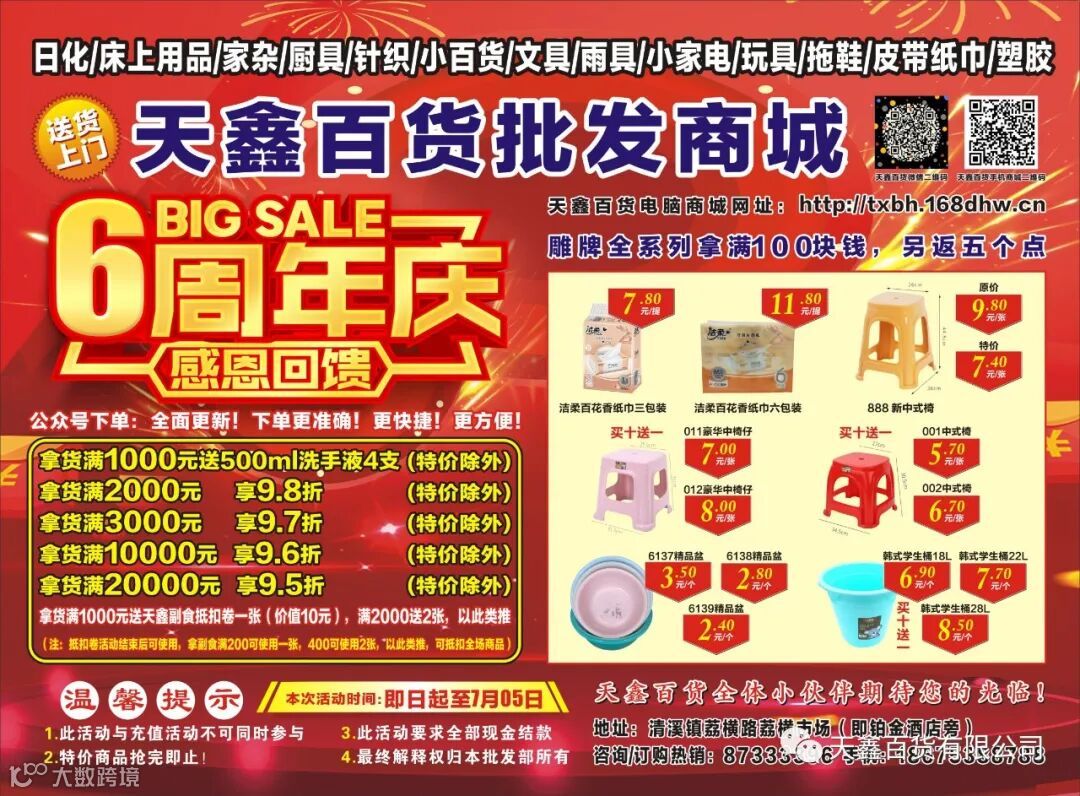 好消息:天鑫百货6周年庆典 联合天鑫副食活动开始啦!活动时间(6月26日至7月5日),特价产品数量有限!数量有限!欢迎新老客户速速抢购……