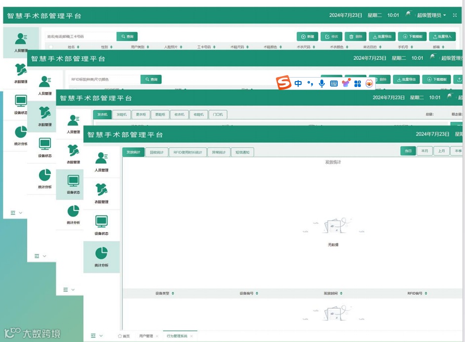 智能手术室行为管理系统通过物联网、RFID技术与多系统集成,能够对以下多维度数据进行统计和反馈,并且可与医院HIS系统对接,支撑手术室管理优化及医护人员行为规范: