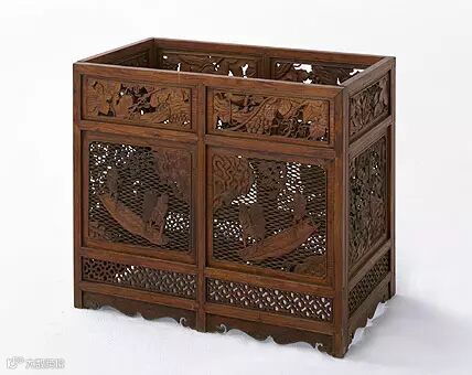 树围四面镂空,每面分三层打槽装板。前后两块围板上层透雕葡萄纹,中间透雕捕鱼图,刻画渔夫摇橹、撒网的生动情景,下层为菱花式透棂。左右两块围板纹样与前后两块基本相同,只是中间为透雕花卉图。腿间有云头形壸门牙板,方腿直足。围板之间以活榫连接,可拆分成四块。