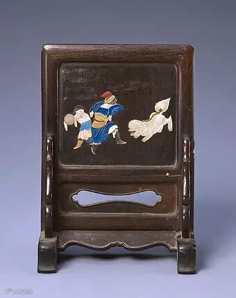 插屏紫檀木质,由屏心、站牙、抱鼓墩组成。屏心两面皆在紫檀木上以螺钿、青金石、椰壳等为原料镶嵌图案,一面为梅花图,一面为番人戏狮图。绦环板处开菱形透孔,壸门式披水牙子,如意头式抱鼓墩。此插屏小巧玲珑,做工精湛,装饰华美,是一件精美的明式家具。