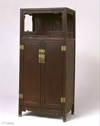 柜格由上格下柜组成。格的正面与两侧面皆开敞,并装券口牙,牙边起阳线,雕双螭、回纹。券口下立透雕螭纹栏杆。柜门采用落堂踩鼓式,镶白铜合叶及面叶。柜下安装雕卷草纹的壸门牙,方足。