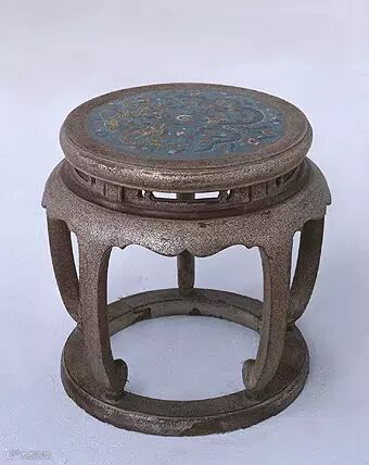 黑漆撒螺钿珐琅面龙戏珠纹圆凳,明,高41cm,面径42.5cm。清宫旧藏