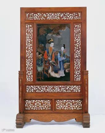此屏风为一对,体形较大,雕工精美,既可摆放在屋门口挡风避尘,屏心的其玻璃画亦可作为观赏品。此屏风虽为清乾隆时利用明代的屏风木架配装玻璃画组合而成,但显得十分得体,庄重而美观。