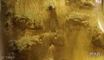 瘿子又称瘤疤,其纹理别称瘿子木,影子木。是“愈伤组织”,在树木受伤后,细胞无性繁殖形成的一种自我保护,古代称之为瘿,其纹理特殊,有旋转的细密花纹,金丝楠木瘿木不仅具形态之美,纯属稀有之作,收藏价值极高。