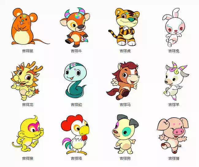 子鼠、丑牛、寅虎、卯兔、辰龙、巳蛇、午马、未羊、申猴、酉鸡、戌狗、亥猪