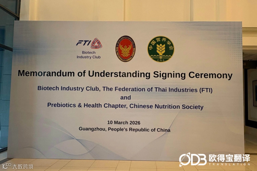 2026年3月10日,泰国—广东医疗生物科技国际合作交流会暨谅解备忘录签署仪式在广州圆满举办。作为本次会议的语言服务合作伙伴,欧得宝翻译提供专业的中英双语同声传译服务,以精准流畅的现场翻译,为中泰医疗生物科技合作筑牢语言桥梁。